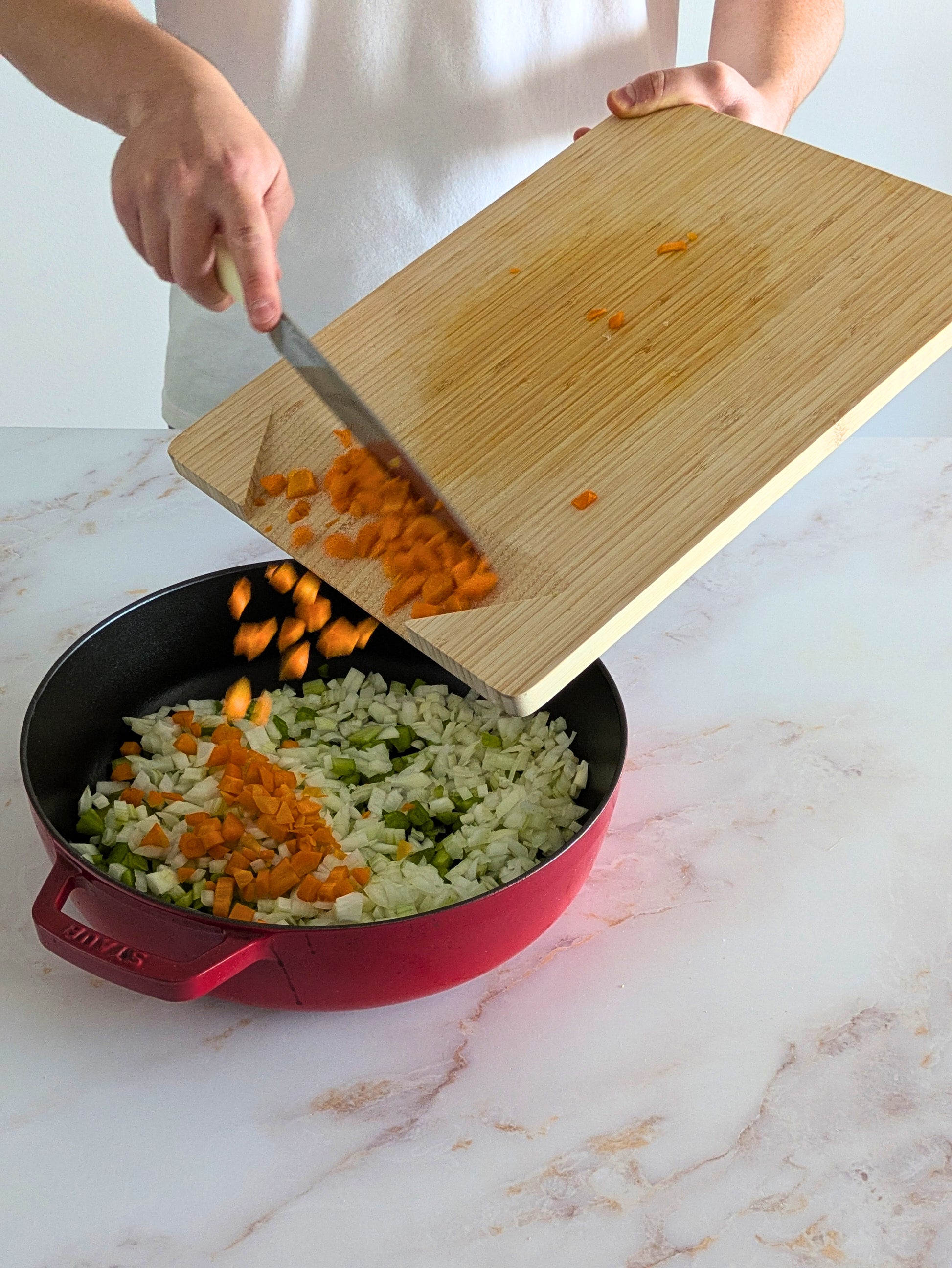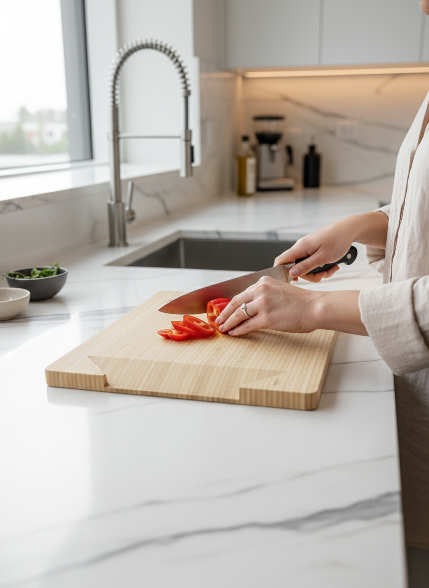 Experience effortless cooking with the brand new Bullseye Board. A stylish cutting board featuring a unique funnelling edge, designed to make kitchen prep a breeze while enhancing your culinary space.